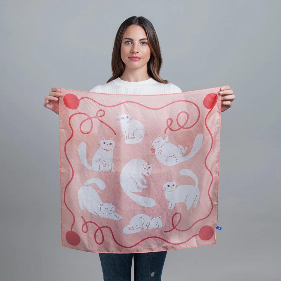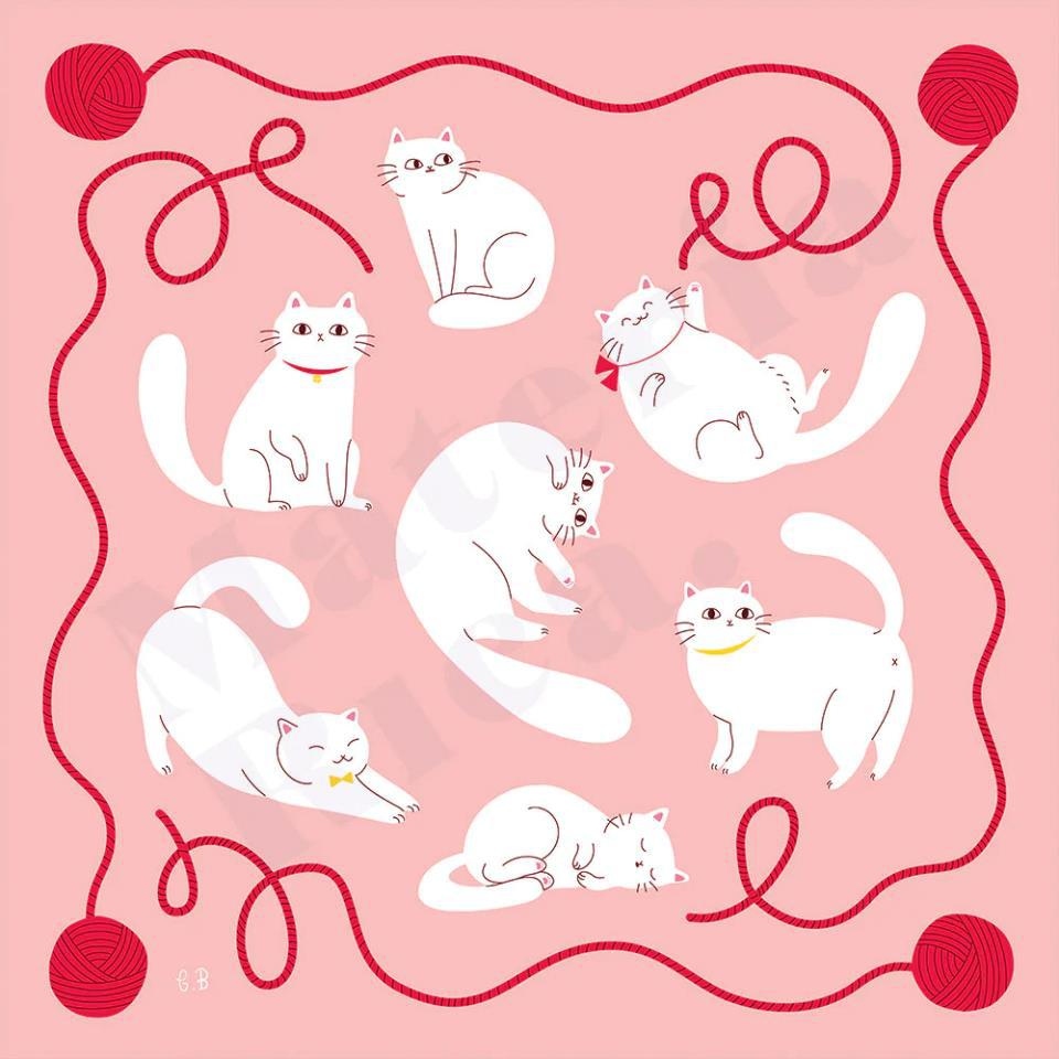 Pañuelo de seda rosa con gatos blancos.