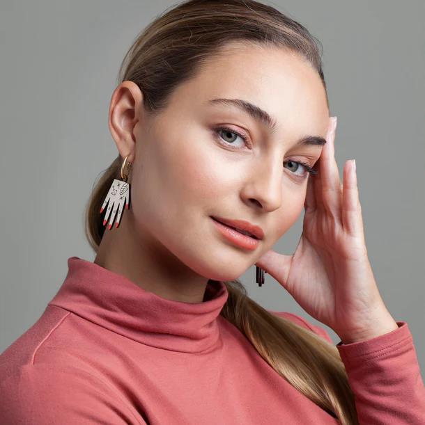 Aretes y collares cortados con láser, pintados a mano y hechos de madera de nogal con certificación FSC. Se Utilizaros barnices no tóxicos y al agua para el acabado de la pintura. Por eso necesitan un cuidado especial ya que son productos artesanales