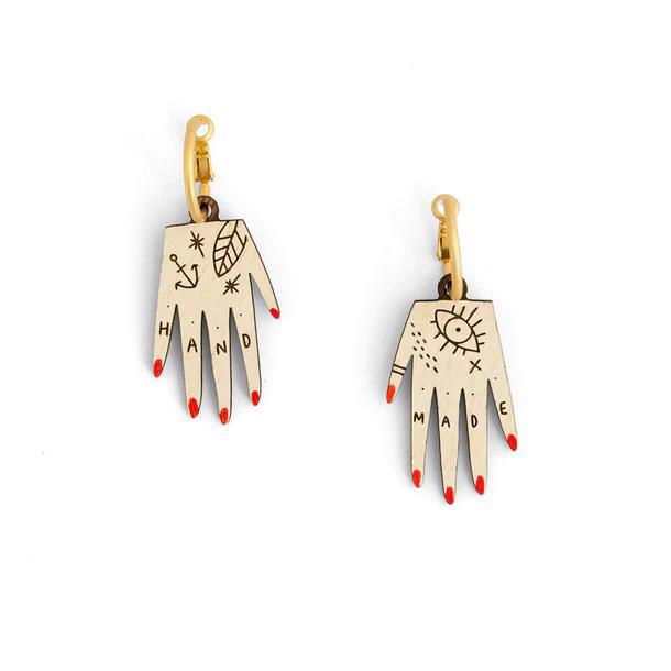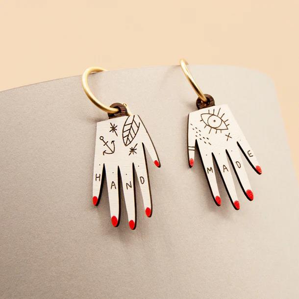 Pendientes con manos con uñas rojas.